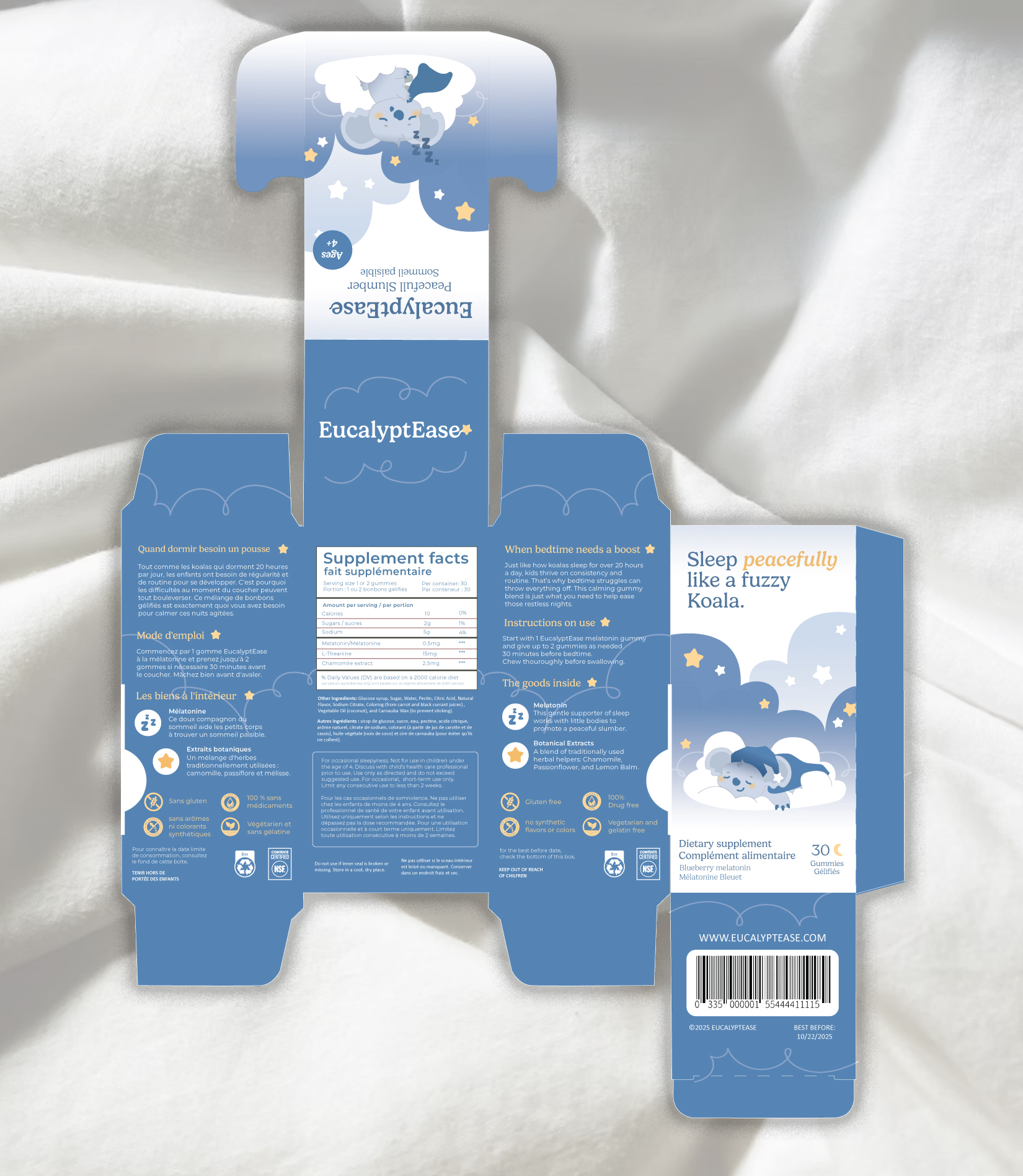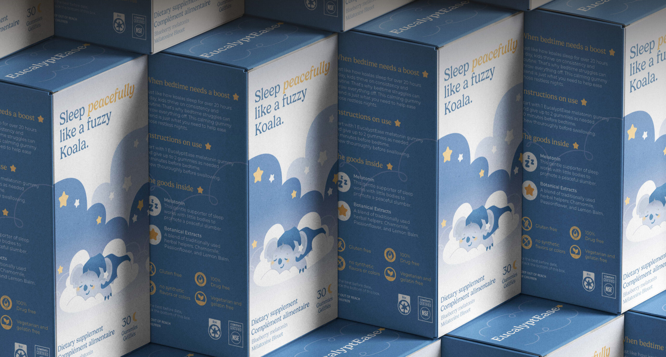 The packaging features a soft pastel blue and yellow color palette, chosen to evoke calmness and reference the night sky, with visual elements such as stars and clouds. A key design feature is an additional locking flap, which serves both functional and narrative purposes. On this flap, a story unfolds visually: a sleepy koala gets ready for bed, eventually shown peacefully sleeping on a cloud with a blanket and nightcap. It’s a soothing design that will be sure to comfort any child with bedtime struggles.