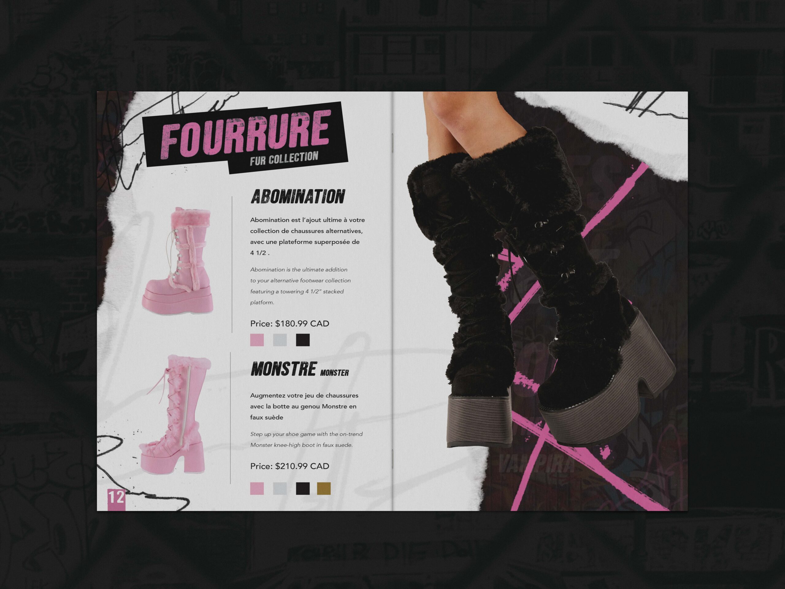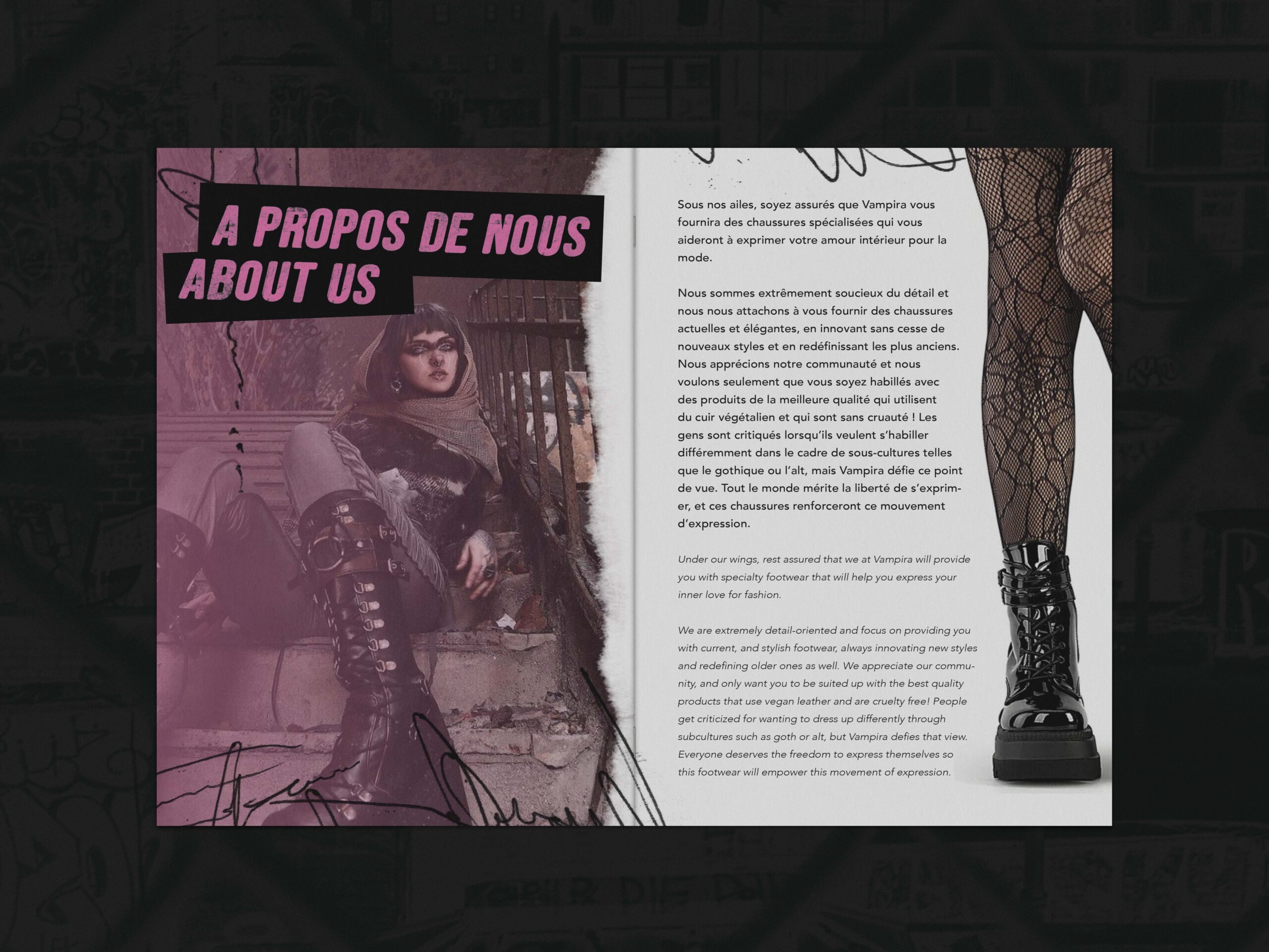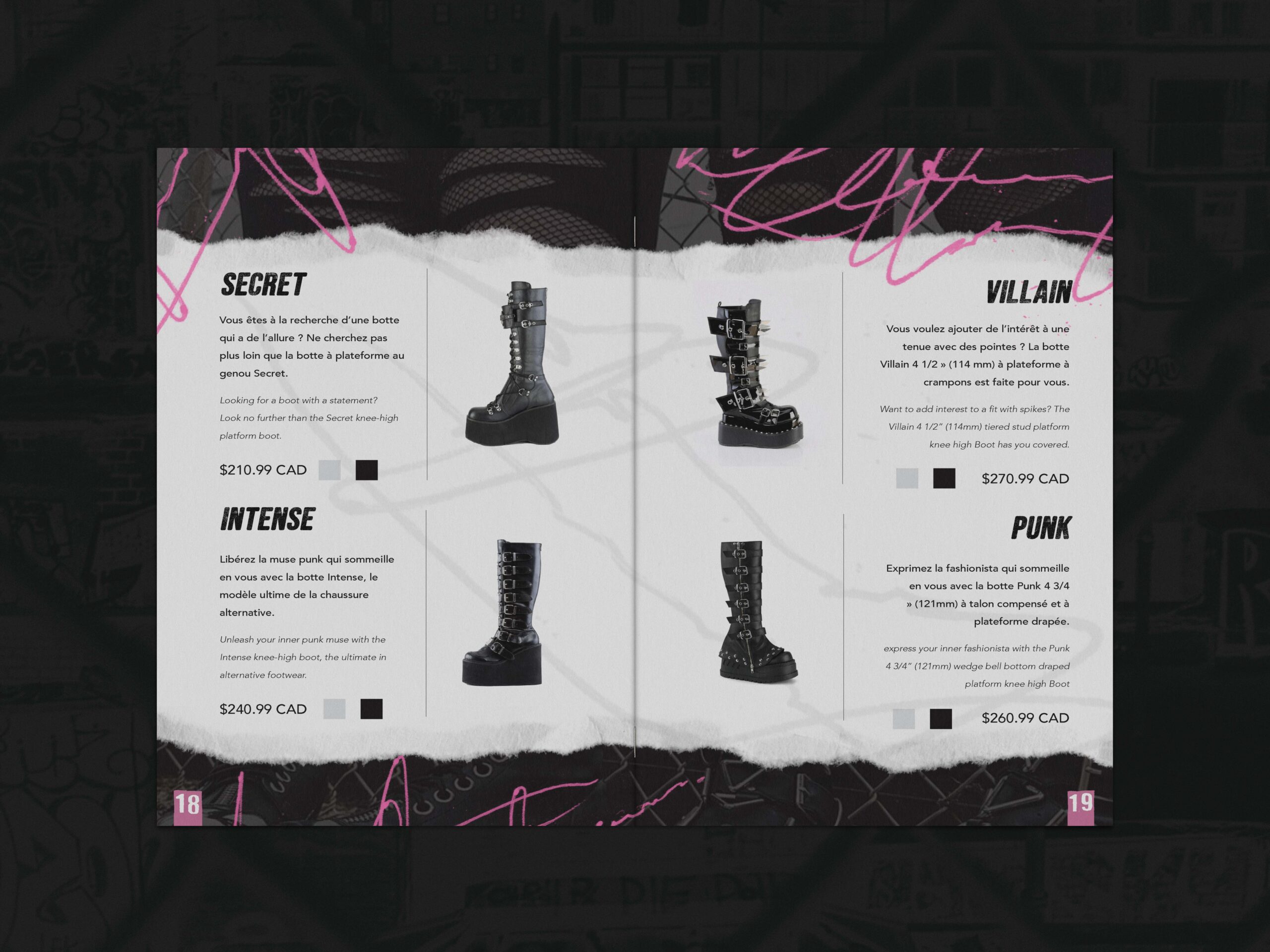 For this third semester project, the objective was to take a preexisting brand and reimagine it through a completely new visual identity. I chose to base my project on Demonia, an alternative clothing brand best known for its bold, unconventional boot and shoe designs. Demonia’s strong presence within gothic and alternative fashion made it an ideal foundation for exploring how an established brand can be transformed while still honoring its core essence.