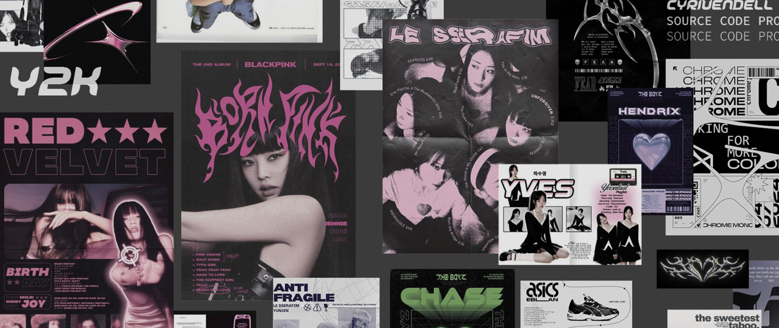 I was heavily inspired by Y2K, techno, and grunge imagery found on Pinterest. As seen in my moodboard, the design features bold visuals, layered textures, a monochromatic colour palette, and flashy elements. Exploring this distinct style allowed me to learn new techniques and develop a greater appreciation for the creativity and intention behind different design aesthetics.